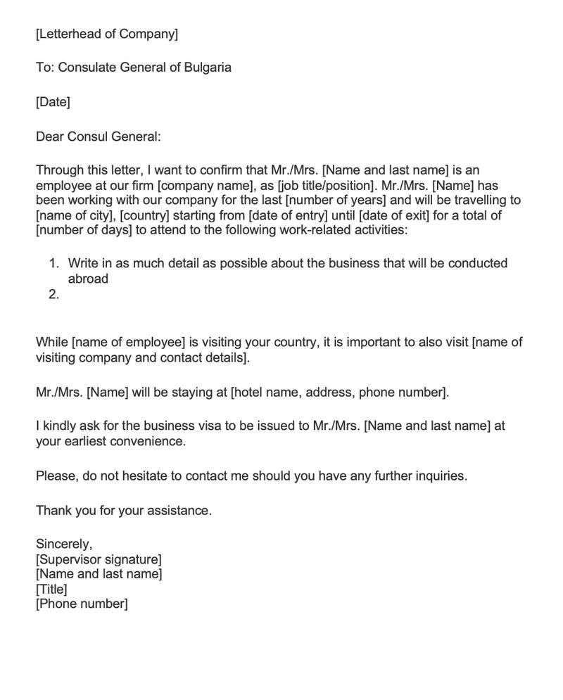 In the Bulgaria visa invitation letter for business travel, the business relationship between the person applying for a Bulgaria visa and the person writing the invitation letter, how long the applicant will stay in the country and what he/she will do during this period should be stated.