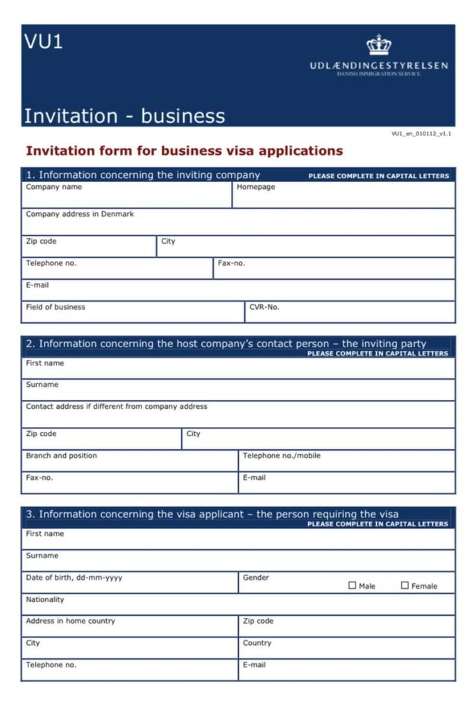 To apply for a Denmark business visa, the VU1 business visa invitation letter on the nyidanmark.dk website must be filled out.
